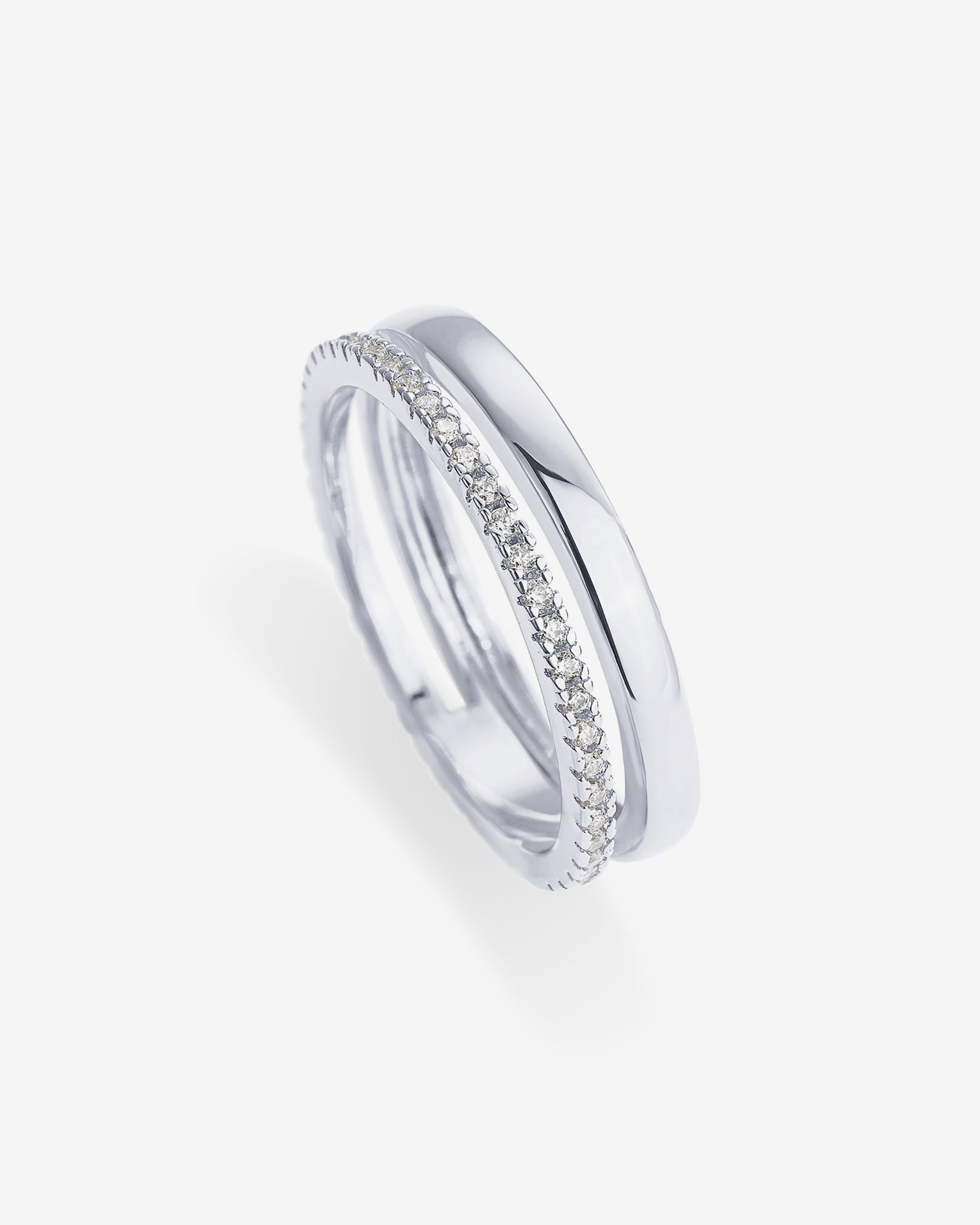 This dual-style ring features a simple band that is discreetly connected to an eternity band crafted with AAAAA cubic zirconia. Making it the perfect stacking ring.